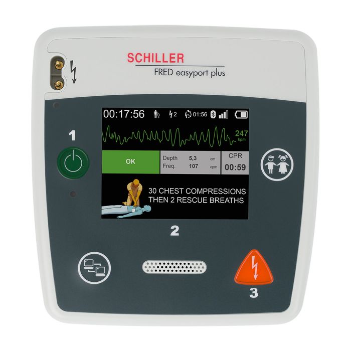 Der halbautomatische FRED easyport® plus FIRST erfordert die Bestätigung des Retters, um einen Schock abzugeben. Auf dem großen Farb-LCD kann eine EKG-Kurve angezeigt werden.